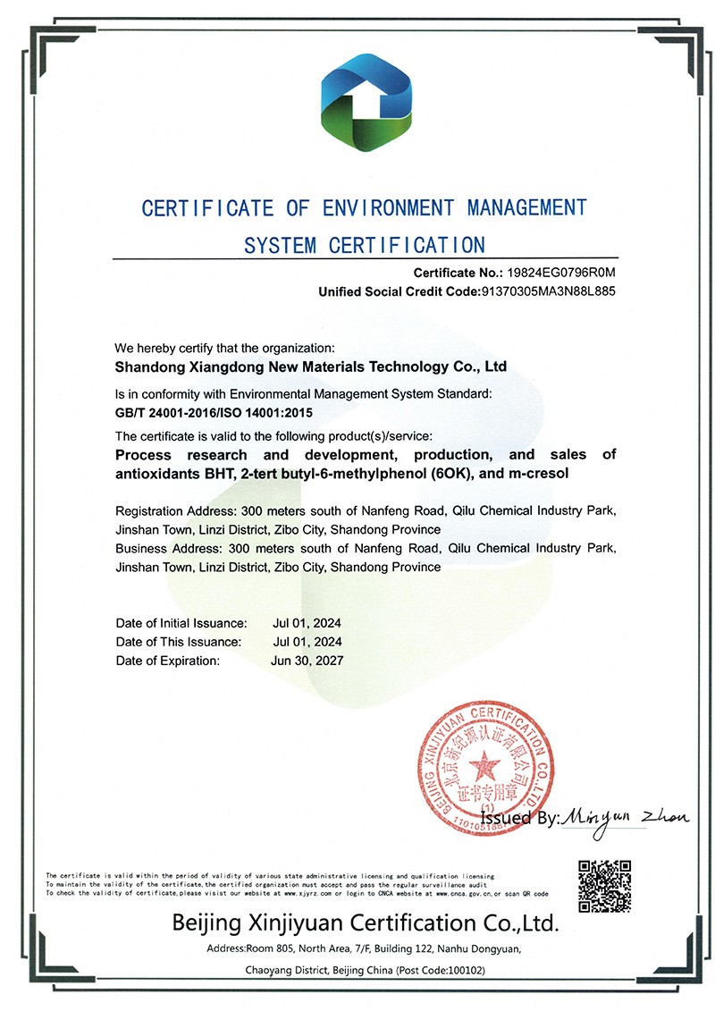 山東祥東新材料科技有限公司1.2萬噸/年6-叔丁基鄰甲(60K)、4-叔丁基鄰甲酚(偏 24 酚)和 4,6-二叔丁基鄰甲酚(偏 246 酚)烷基甲酚項目竣工環境保護驗收監測報告